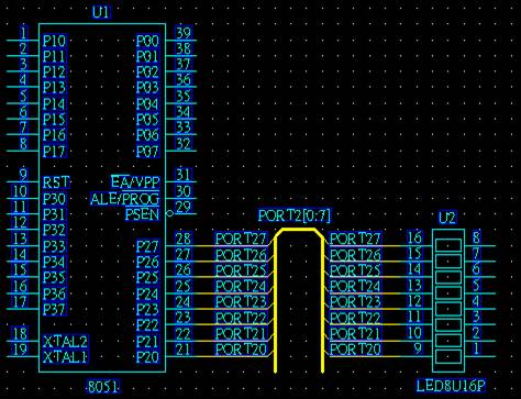 (5) 鼠標(biāo)左鍵先點(diǎn)一下8051的第21支接腳端點(diǎn),拉出一條連接線,在匯流排上點(diǎn)一下鼠標(biāo)左鍵結(jié)束連接線,出現(xiàn)「新增匯流排網(wǎng)路名稱 (Add Bus Net name)」對(duì)話方塊(如圖25所示),其預(yù)設(shè)為PORT20,按鍵盤[Enter] 鍵,完成第一條匯流排連接線(如圖26所示)。