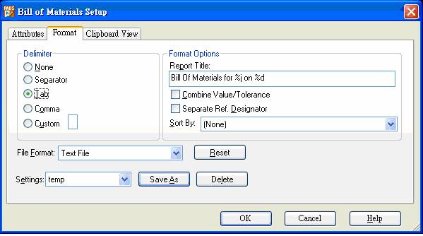 (8) 記得要將設(shè)定值儲存在暫存檔中,以免輸出的BOM表格式是修改前的設(shè)定。請按「存檔 (Save As)」 ,并輸入暫存檔名temp。