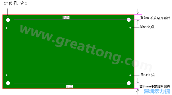 3、關(guān)于留5mm邊:畫PCB時,在長邊方向要留不少于3mm的邊用于貼片機運送電路板,此范圍內(nèi)貼片機無法貼裝器件。此范圍內(nèi)不要放置貼片器件。如圖: