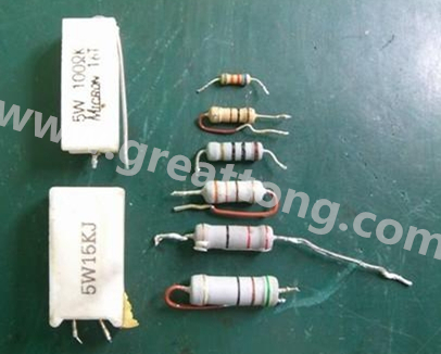 圖片中左方為大功率水泥電阻,可承受較大功率超額,右方則為一般常見的電阻,其上的色碼標(biāo)示出其阻值及誤差。