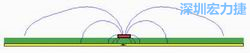 當(dāng)一條表層線導(dǎo)線與周圍導(dǎo)線距離較遠(yuǎn)且相互隔離時(shí)(圖3),沿這條導(dǎo)線傳播的訊號(hào)的一些場(chǎng)線將僅僅分佈在導(dǎo)線材料內(nèi)部,而另一些場(chǎng)線則穿越空氣分佈在訊號(hào)與返迴路徑之間。延伸到導(dǎo)線寬度之外的場(chǎng)線稱為邊緣場(chǎng)線。在一條50歐姆的FR4表層線中,訊號(hào)與返迴路徑之間的電容器約有一半是由邊緣場(chǎng)引起的。