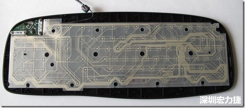但是光只有PTF是沒辦法辦法取代原來金手指的按鍵線路,這裡還使用了類似【Metal dome】的Polydome技術,仔細看下面的第一張圖片,在圓形的節(jié)點旁邊有個圓形的開口,這個開口墊高了鍵盤按鍵的接觸點線路。