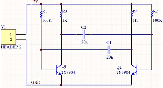 接下來(lái)可以開(kāi)始畫(huà)電路原理圖。本章將使用如圖3所示的電路圖為例進(jìn)行講解。這個(gè)電路是由兩個(gè)2N3904三極管組成的非穩(wěn)態(tài)多諧振蕩器。