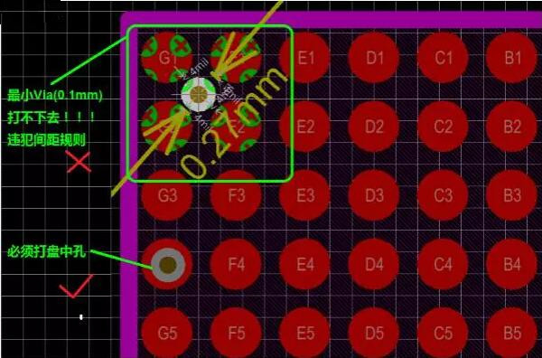 如上圖所示,最小激光孔0.1mm(4mil)沒(méi)辦法打在焊盤(pán)之間,因其焊盤(pán)邊沿對(duì)角線最大間距0.27mm。最小的孔打在中間也滿足不了最小間距4mil的安全規(guī)則。因此,只能打盤(pán)中孔。但是,盤(pán)中孔工藝復(fù)雜,需要后續(xù)處理,填孔塞孔,加電鍍,磨平表面等等工序。加工成本也會(huì)相應(yīng)增加。
