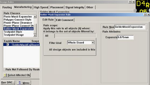 5. 而對于阻焊的調整則可以通過按D、R調出[Manufacturing]制作設計規(guī)則的[Solder-Mask Expansion Rule]設置項直接設定單邊放大值。