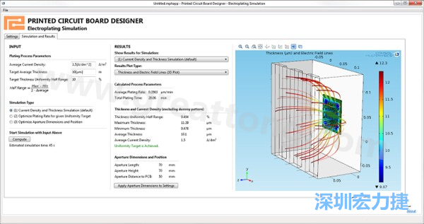 電鍍App允許PCB板設(shè)計人員導(dǎo)入不同的設(shè)計(包含或不含虛置圖形),點擊計算,然后就能查看所仿真的厚度均勻性-深圳宏力捷