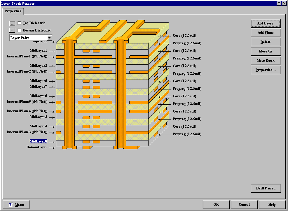 Protel99 SE現(xiàn)擴(kuò)展到32個(gè)信號(hào)層,16個(gè)內(nèi)電層,16個(gè)機(jī)械層,在層堆棧管理器用戶可定義板層結(jié)構(gòu),可以看到層堆棧的立體效果。在開始一個(gè)新文件時(shí),可以觀看例子中的演示效果。層名稱可以定義或重命名??梢孕薷慕橘|(zhì)參數(shù),可以改變層的放置順序。