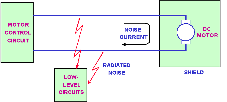 了解噪音如何傳輸有助于辨識電路內(nèi)部的電磁干擾問題。噪音的發(fā)生必需要有來源(source)、藕合路徑(couplingpath)以及易感染的接收器(susceptiblereceptor)[Ott,1988],這三者必需一起出現(xiàn)才會有EMI問題的存在,圖1說明EMI如何以藕合方式進(jìn)入一個系統(tǒng)。因此,若是三者之一被排除于系統(tǒng)之外或被減少,干擾才會消失或降低。圖1是以馬達(dá)控制為例的EMI說明,其中功率級至馬達(dá)的線圈電流是產(chǎn)生EMI的來源,控制器的低階信號(數(shù)位或類比信號)是易受干擾的接收器,藕合路徑則可能是經(jīng)由傳導(dǎo)方式(經(jīng)由電源或地線)或輻射方式。
