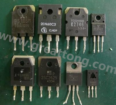 照片中上方為電源內(nèi)常見的N MOSFET(N型金氧半導(dǎo)體場效晶體管),下方則是NPN BJT(NPN型雙接面晶體管)。